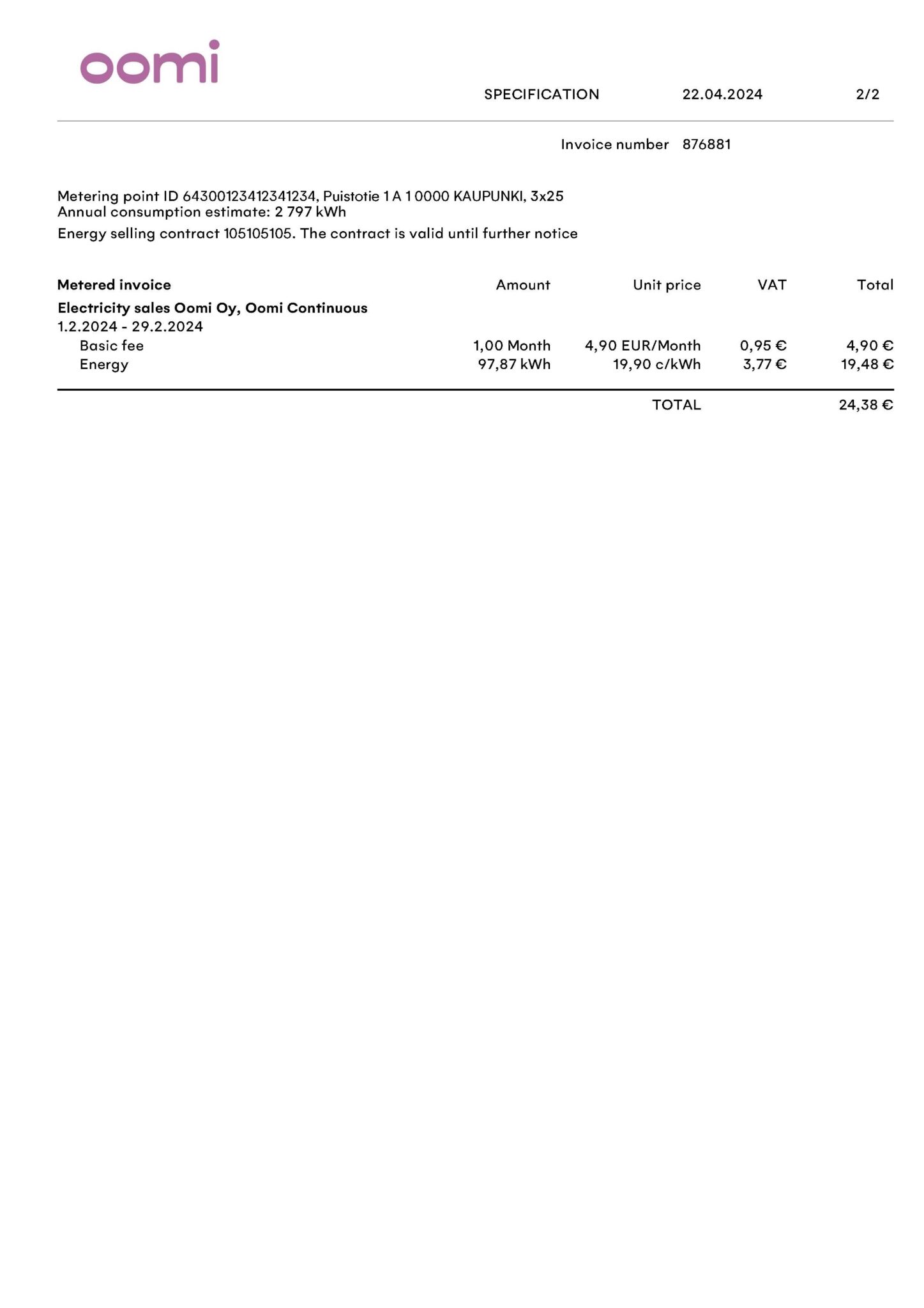 The invoice specification indicates the basic fee (€/month), amount of energy consumed (kWh), unit prices (c/kWh) and their sums. If the invoice also covers the electricity distribution alongside the electricity consumed, the specification also lists the sums related to it and the relevant electricity tax.