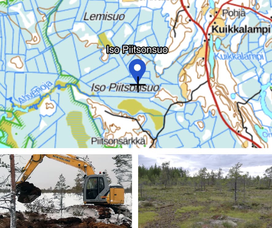 The wetland ecosystem that has been harmed by artificial drainage will be restored back towards a natural state. The restoration project began in early winter 2021 and will continue until 2023. The restoration of the most challenging part of Iso Piitsonsuo, a soft area of bog ponds in the centre of the wetland, was completed in February 2022. The entire area covers roughly 350 hectares. Read more about the location on Hiilipörssi’s website (link in Finnish).