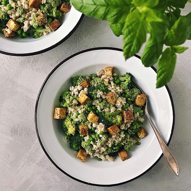 - Sekoita ohran joukkoon parsakaali, herneet ja paistetut tofukuutiot.