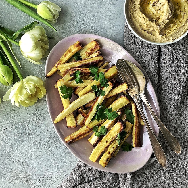 Palsternakkaranskalaiset ja valkopapuhummus on terveellinen ja herkullinen vaihtoehto perinteisestä perunasta valmistettaville ranskalaisille. Palsternakkaranskalaiset ja dippi maistuvat niin naposteluruokana sellaisenaan tai vaikkapa valitsemasi ruuan lisukkeena. Lue alta herkkuohje ja vinkit, joilla loihdit palsternakkaranskalaisista superrapeita ja herkullisia. Tämä yhdistelmä hurmaa varmasti!
