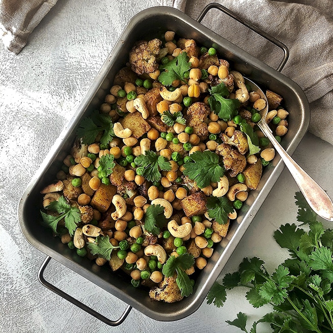 Peruna-kukkakaalicurry valmistuu vaivatta ja tiskiä säästäen yhden pellin taktiikalla. Tuore korianteri, paahdetut cashewpähkinät ja nokare kasvipohjaista ranskankermaa nostavat simppelin arkiaterian luksusluokkaan.