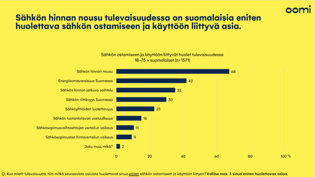 Kysyttäessä suomalaisilta huolista sähkön ostamiseen ja käyttöön liittyen tulevaisuudessa, nousi suurimmaksi huoleksi sähkön hinnan nousu (68 %). Muiksi huoliksi nousivat energiaomavaraisuus Suomessa (42 %), sähkön hinnan jatkuva vaihtelu (35 %) sekä sähkön riittävyys Suomessa (30 %). Vähiten huolettavat sähköyhtiöiden luotettavuus (23 %), sähkön tuotantotavan vastuullisuus (15 %), sähkösopimusvaihtoehtojen vertailun vaikeus (11 %) ja sähkösopimusten hintavertailun vaikeus (9 %).