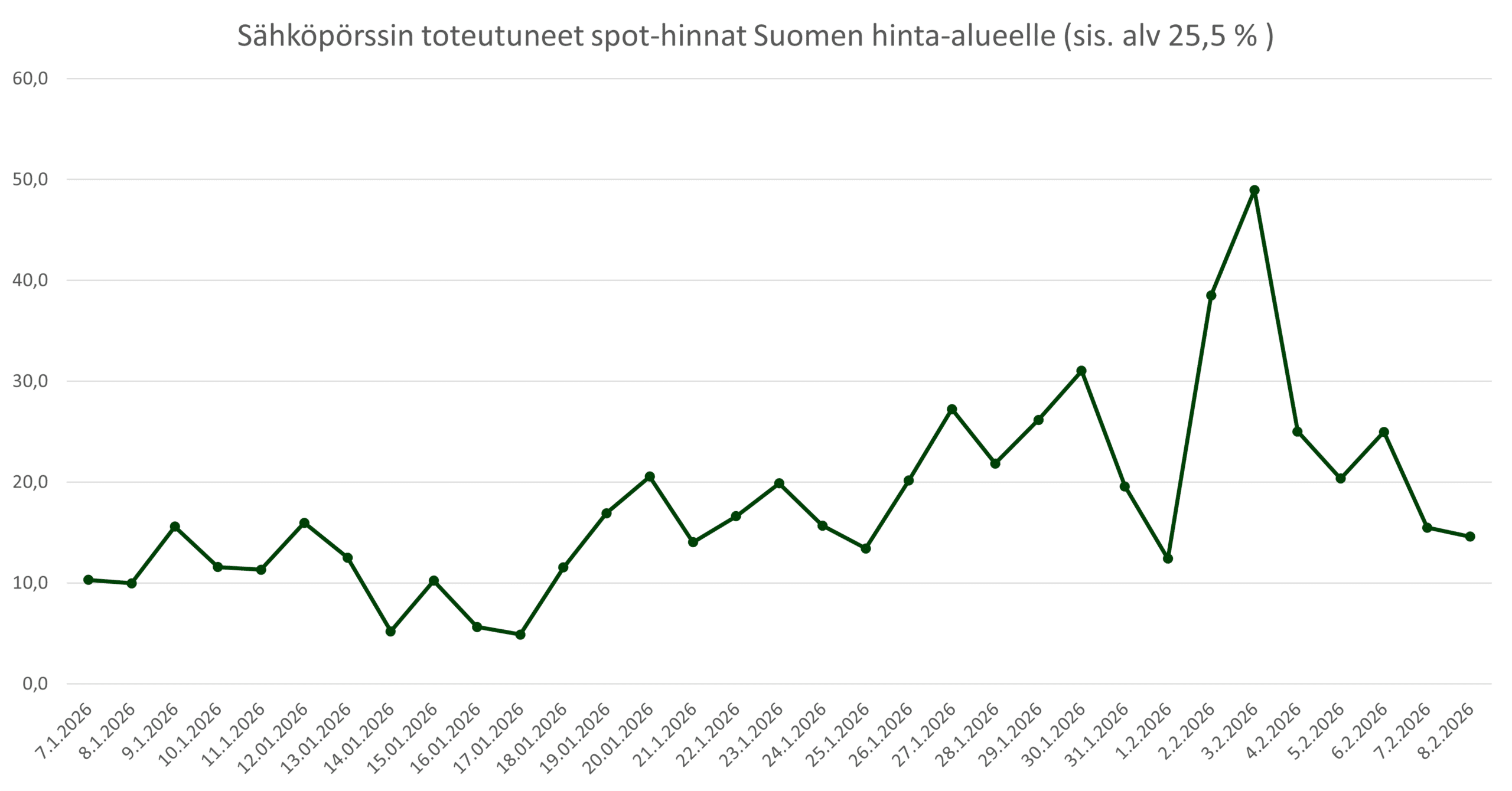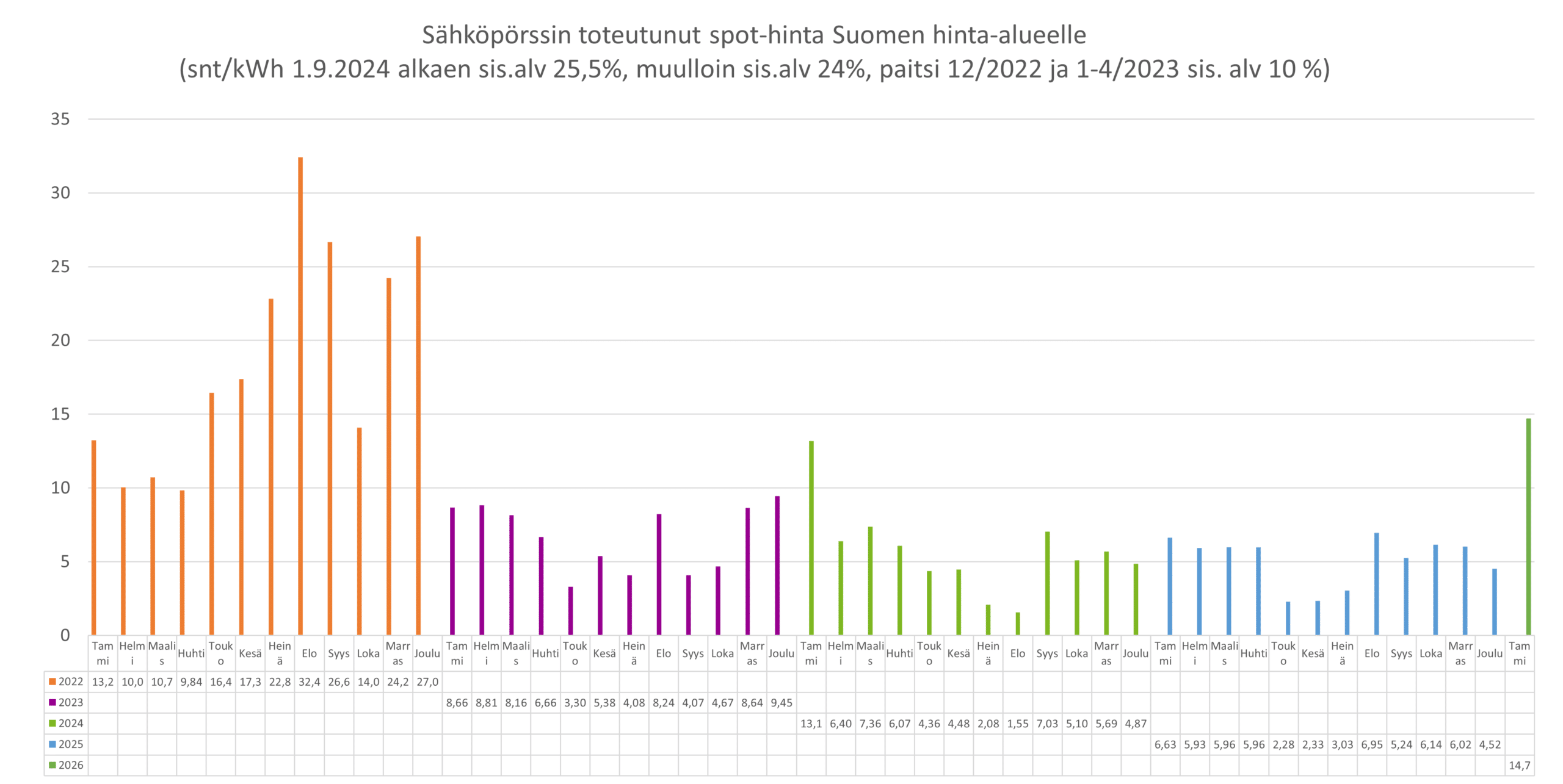 - Viikon 6 spot-hinta oli 26,84 snt/kWh (sis. alv 25,5 %) ja viikon 4 spot-hinta oli 22,63 snt/kWh (sis. alv 25,5 %).