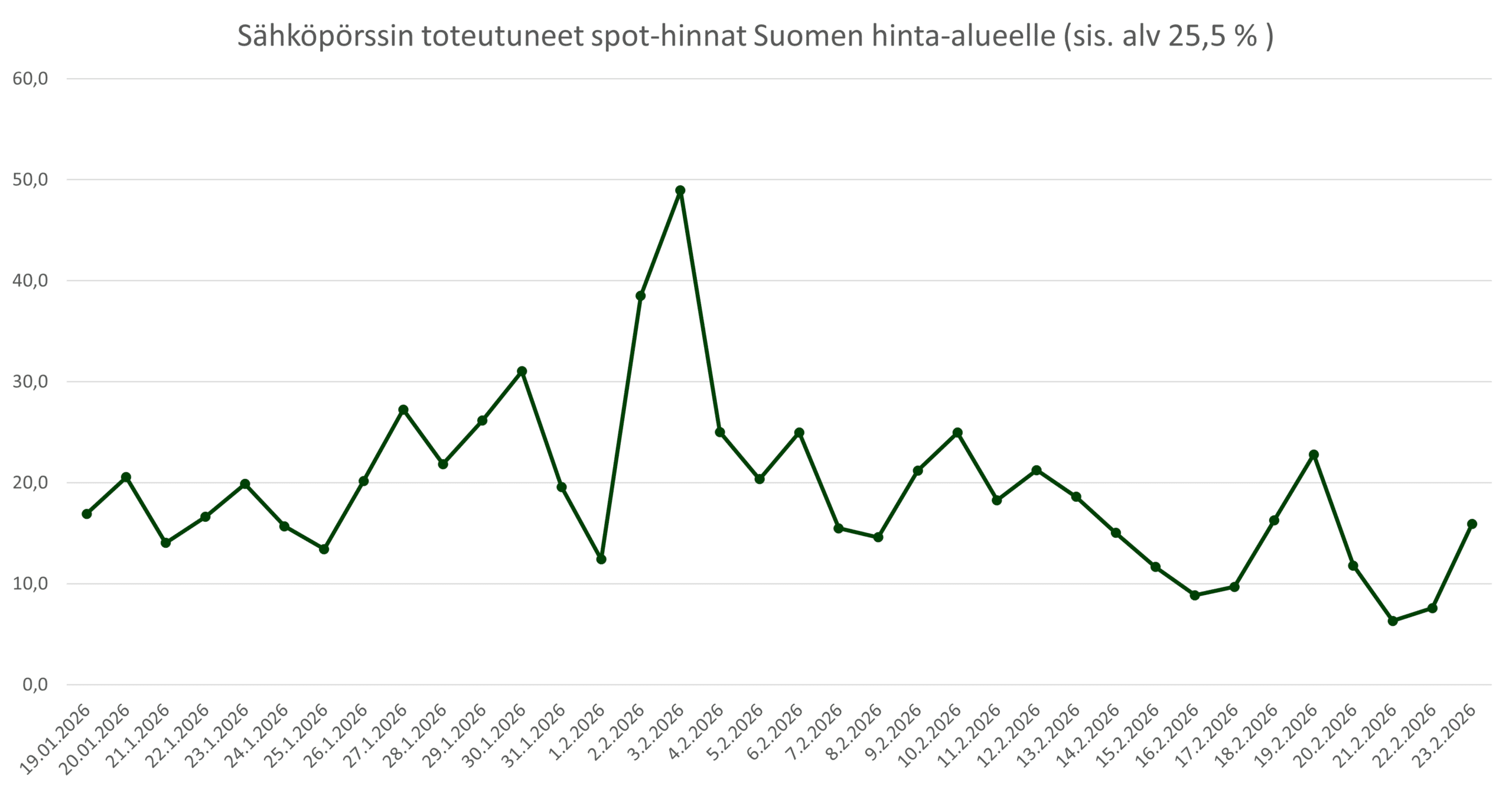 - Viikon 8 spot-hinta oli 11,89 snt/kWh (sis. alv 25,5 %) ja viikon 7 spot-hinta oli 18,71 snt/kWh (sis. alv 25,5 %).