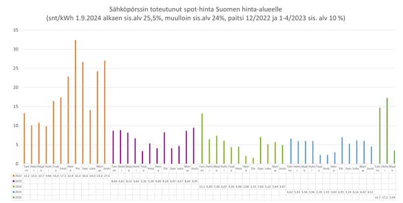 - Viikon 14 spot-hinta oli 4,35 snt/kWh (sis. alv 25,5 %) ja viikon 13 spot-hinta oli 1,76 snt/kWh (sis. alv 25,5 %).