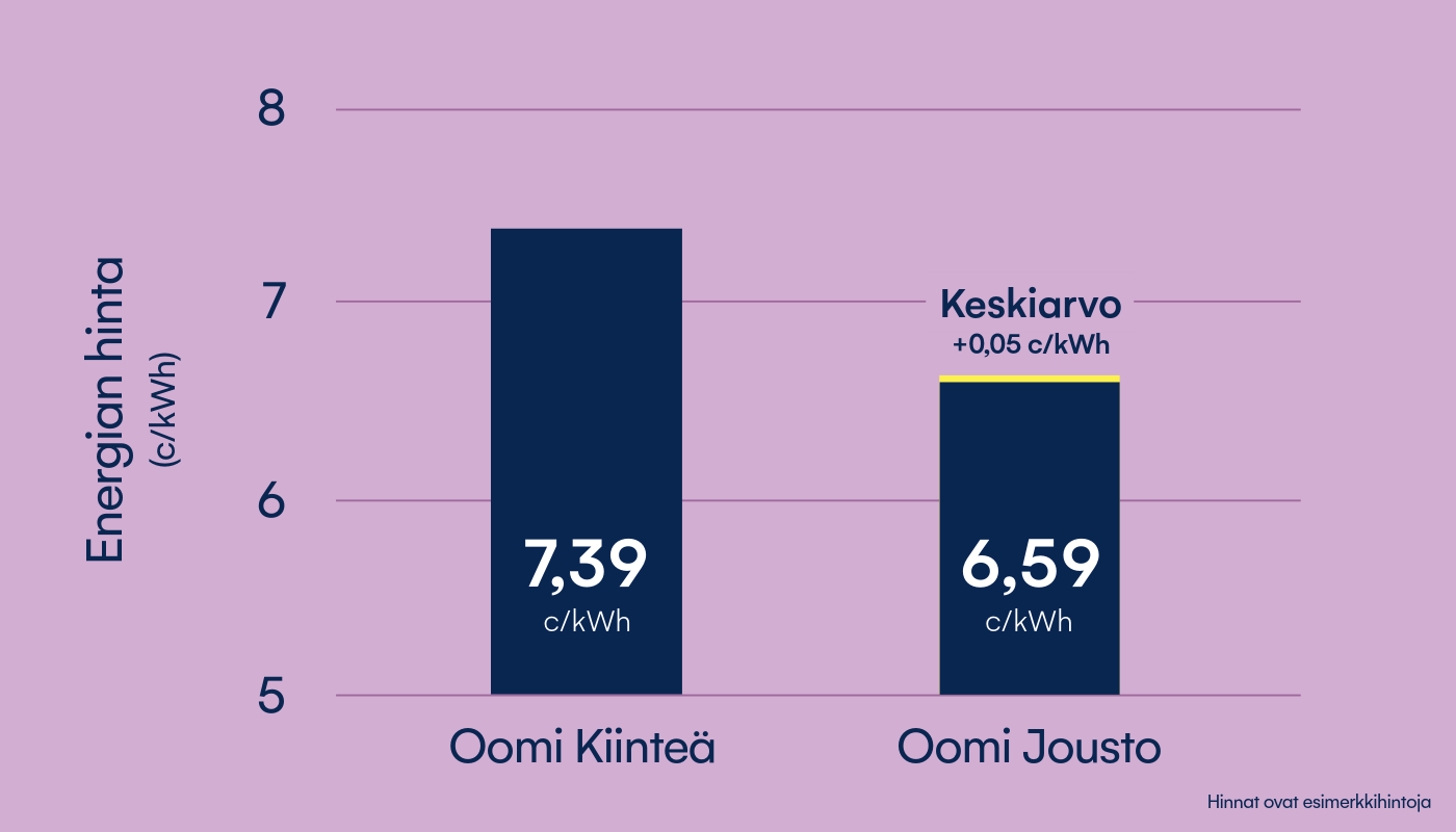 *Arvioitu kulutusvaikutus perustuu otokseen Oomi Jousto 12 kk:n olemassa olevien asiakkaiden toteutuneesta kulutusvaikutuksesta, joilla on ollut Oomi Jousto yhtäjaksoisesti 12 kk aikavälillä 1.11.2024-31.10.2025 (otoskoko=2 265). Kulutusvaikutuksen vaihteluväli on tyypillisesti noin -3,9 → + 1,6 c/kWh. Hinnat sisältävät alv 25,5 %.