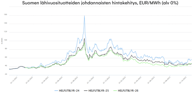 Sähkön johdannaismarkkinoilla hintojen laskutrendi on jatkunut koko vuoden 2023 ajan. Vasta nyt syksyllä, kun kulutukset ovat kasvaneet lämpötilojen laskettua, on myös johdannaishinnat lähteneet nousuun. Pitkään jatkunutta laskua on tukenut vahva hydrologinen tilanne, kun sää on toteutunut normaalia sateisempana. Myös Euroopan kaasuvarastojen hyvä täyttöaste on pitänyt Kesi-Euroopan hintatasoa maltillisena ja vähentänyt huolia kaasun riittävyydestä ensi talvena, vaikka Venäjän kaasutoimitukset ovatkin päättyneet